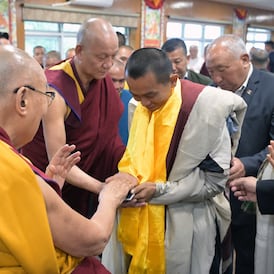 སྤྱི་ནོར་༸གོང་ས་༸སྐྱབས་མགོན་ཆེན་པོ་མཆོག་གིས་མང་མཇལ་སྩལ་གནང་མཛད་པའི་ཁྲོད། ཝིཡེཏ་ནམ་གྱི་གྲགས་ཆེ་བའི་ནང་པའི་དགེ་སློང་ (Thich Minh Tue) ལགས་དང་ལྷན་དུ་ཝིཡེཏ་ནམ་ནས་རྒྱ་གར་བར་གོམ་བགྲོད་བསྐྱོན་ཏེ་ཕེབས་མཁན་དགེ་སློང་བཅུ་གཉིས་ལ་མཇལ་ཁ་སྩལ་གནང་མཛད་ཡོད་པ་རེད།
