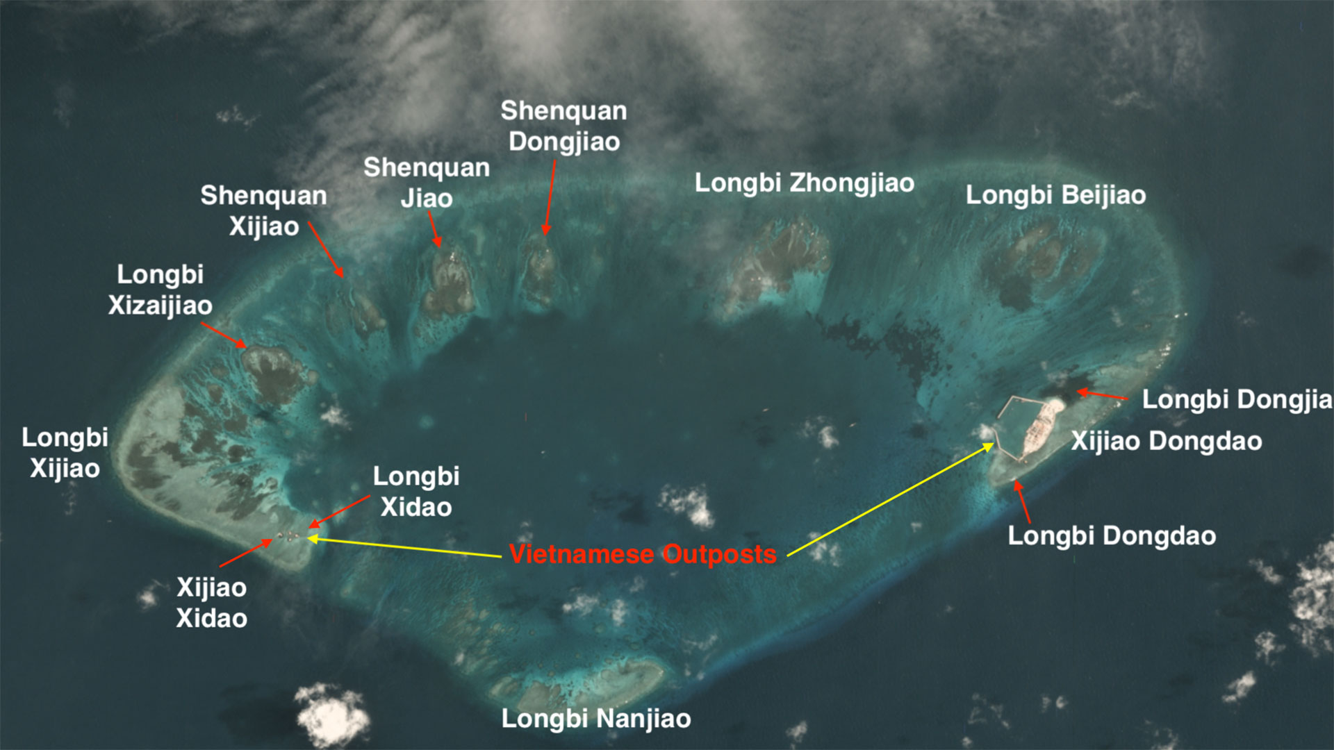 One of the Vietnamese outposts on West Reef that China says was illegally invaded and occupied. China now calls this outpost 'Longbi Xidao' or 'Xijiao Xidao.'