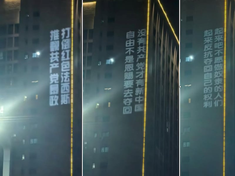 重庆大学城现巨幅投影标语 呼吁推翻中共政权