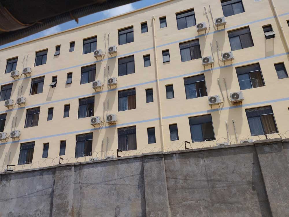 该园区每栋五层楼高的宿舍窗户上都装有金属栏杆,这表明它们的设计目的是为了不让人出来。